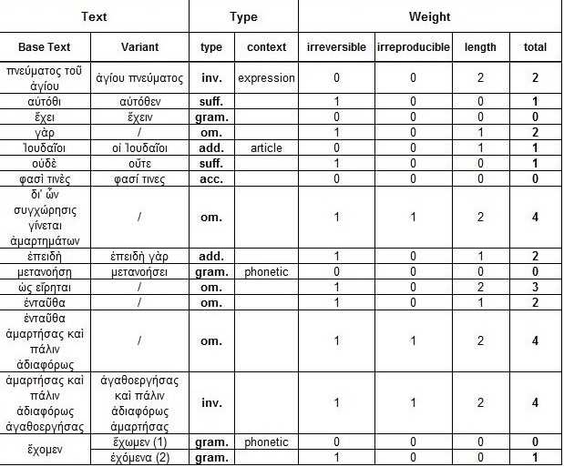 In practice, it is difficult to assess which readings are significant, or as Salemans puts it, "relationship-revealing" (Salemans 2000, passim), and this difficulty has been noted by many scholars. Roughly speaking, a significant error is an error that cannot be easily produced independently by several copyists (polygenesis), and cannot be corrected easily, in other words a good significant error will be irreversible and not reproducible. It is not easy to determine a priori which types of variant readings will indeed satisfy to those two criteria, and some scholars have suggested that the character of being significant or not is not something absolute, but rather something that is more or less likely. This is why some have tried to "weight" variant readings: Macé/Sanspeur 2000, Spencer et al. 2004, Macé/De Vos/Geuten 2012, etc. There have been as well some attempts at automating partly the procedures to measure the significance of variants (see Roelli/Bachmann 2010, Camps/Canfiero 2015), but at any event the evaluation of the variant readings will remain largely a philological task.