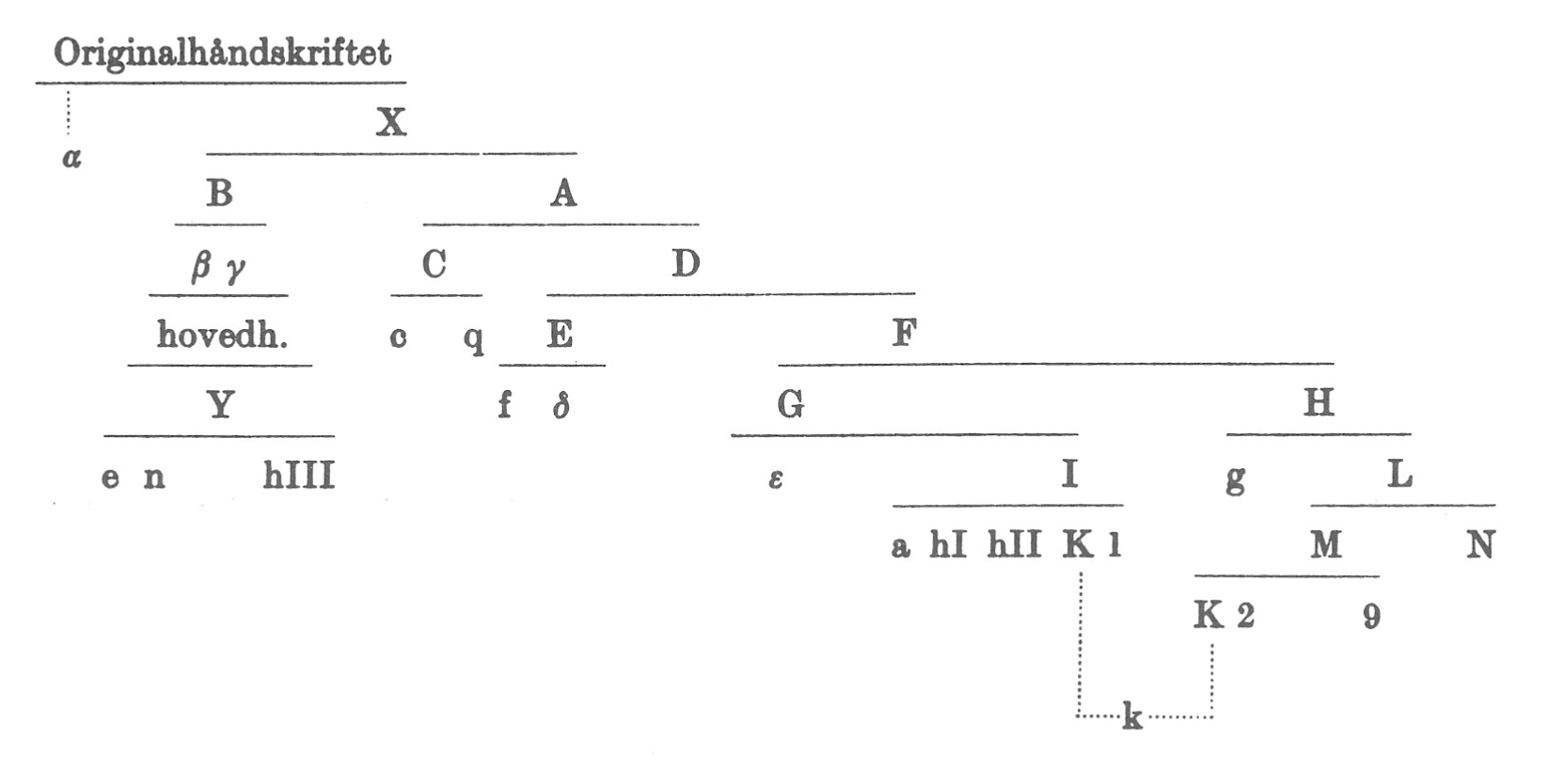 It is not uncommon that the oldest preserved witnesses in a tradition are fragmentary, so that the supposedly best manuscript is not found at the top of the stemma, but still closer to the origin of the tradition than later manuscripts. This is the case with the Old Norwegian Konungs skuggsjá ‘The King’s Mirror’ (mid-13th century), in which the fragments β and γ are located above the main manuscript, hovedh[åndskriftet], which is commonly regarded as the codex optimus. The fragments β and γ are very short, so neither can be termed a codex optimus in any meaningful sense. A fragment is simply not a codex any more, even if it once might have been part of a complete codex.