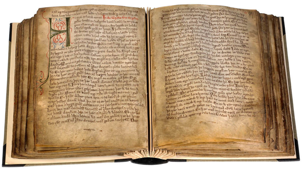 Fig. 1. The Old Norwegian Homily Book in the manuscript Copenhagen, AM 619 4to (ca. 1200–1225). This manuscript is well preserved, but the binding is of a recent date. The photograph clearly shows how the manuscript is built up of individual quires.