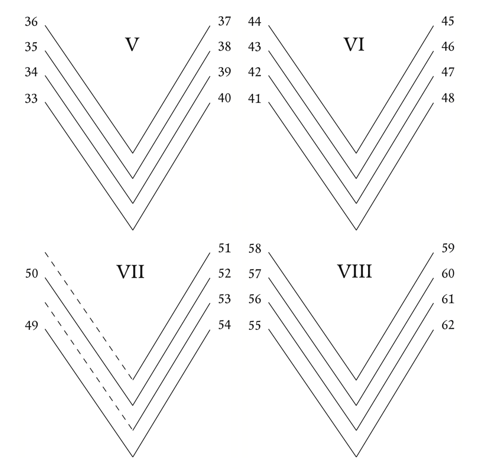 Fig. 2. Detail from the collation of the manuscript AM 619 4to (from Haugen and Ommundsen 2010, 251). This diagram shows four of the quires, V–VIII, each being a quaternio of 8 folios or 4 double folios (bifolia). In quire VII, two leaves are missing and indicated by dotted lines. Note that lost folios usually are not numbered, so that in quire VII, there will be only six numbered folios.