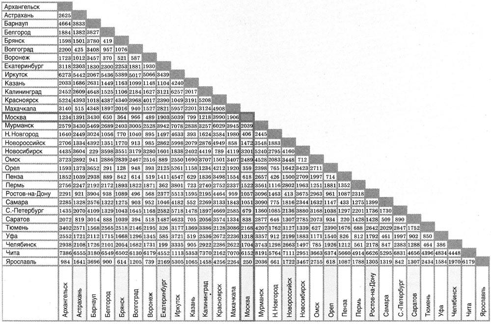 Fig.1. An every-day example of a distance matrix listing road distances (in km) between important Russian tows.