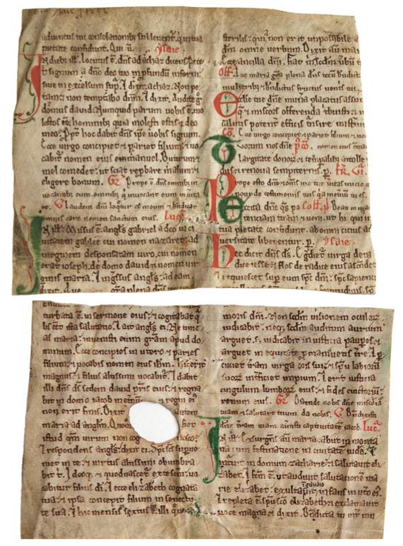 Fig. 2. These two partially preserved leaves (Oslo, NRA Lat fragm 764, fol. 1–2v) are all that remains of a liturgical manuscript kept in Norway, cf. Ommundsen (2010: 133). Note the large hole in the parchment in the lower fragment. The text continues unbroken on the other side of the hole, so it must originally have been in the leaf. It is thus not an example of a lacuna, which is the result of later damage to a manuscript.