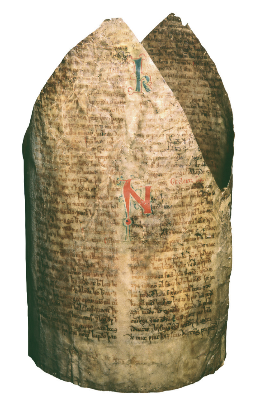 Fig. 1. The fragment of Strengleikar, now Copenhagen, AM 666 b 4to, showing how it was cut to be used as the lining in a mitra. The rest of the manuscript came to Sweden and is catalogued as Uppsala, De la Gardie 4-7 fol.