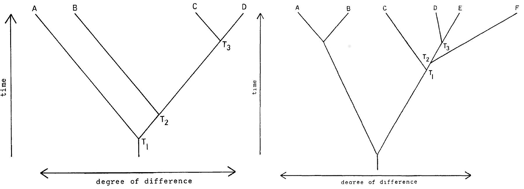 Fig. 1. A cladogram and phylogram according to Mayr (Mayr 1965, 81 and 82, respectively). The phylogram (right) represents the evolution of apes with F as Homo sapiens.
